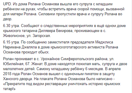 "Новая волна репрессий против крымских татар. Силовая акция оккупантов для запугивания активиста. Готовим соответствующее обращение в Совет Европы и к странам-членам организации", - написал в своем Facebook глава делегации Верховной Рады в ПАСЕ народный депутат Владимир Арьев.