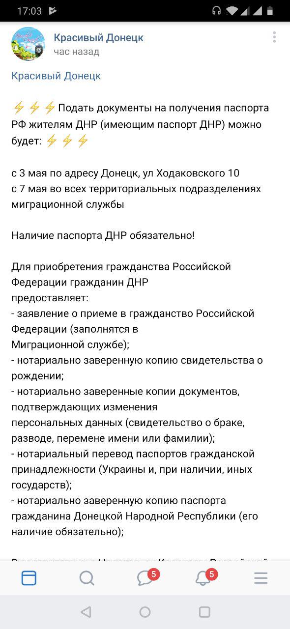 В Telegram-канале "Красивый Донецк" сообщается, что для подачи документов на гражданство РФ жителям "ДНР" нужно иметь: