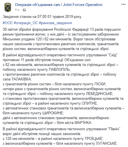 В частности, речь идет о том, что режим прекращения огня со стороны противника 30 апреля был нарушен 13 раз, два из которых использовались запрещенные минскими соглашениями минометы. Также обстрелы велись из ракетных комплексов, гранатометов, пулеметов и стрелкового оружия.