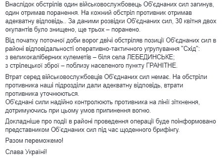 В результате один военнослужащий Объединенных сил погиб, один получил ранения. По данным украинской разведки, 30 апреля двух двое противников были убиты, еще трое - ранены.