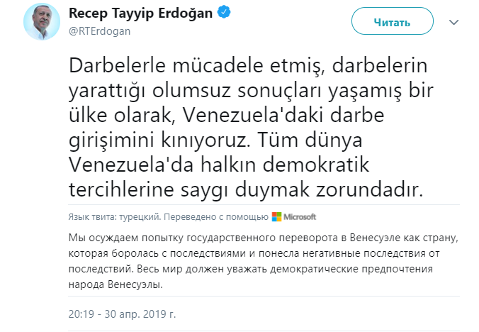 При этом Турция осудила попытку переворота и попытки США "назначать губернаторов" в другие страны и поддержала законное правительство Венесуэлы. Власти Турции отметили, что власть должна меняться только через выборы, а не через перевороты.