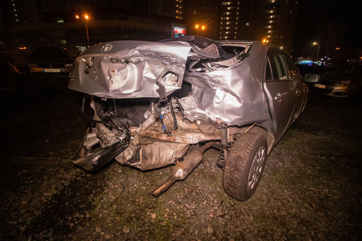 Инцидент произошел около 00:30. Автомобиль Mercedes, который ехал по проспекту Григоренко в сторону улицы Бориса Гмыри, вылетел на зеленую зону. По версии очевидцев, случилось этого потому, что водитель машины проигнорировал разделение проезжей части.