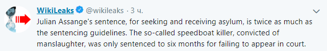 Также говорится о том, что приговор Джулиана Ассанжа вдвое больше, чем для осужденных за убийство. "А ведь он был приговорен к шести месяцам лишения свободы лишь за то, что он не явился в суд", - говорится в сообщении.