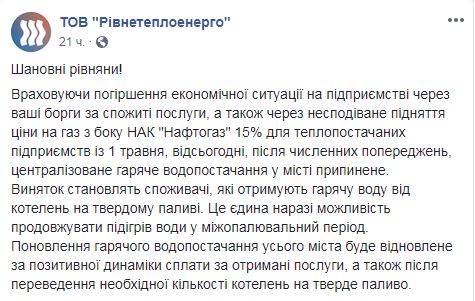 В частности, "Рівнетеплоенерго" в Facebook сообщает, что подача горячей воды в Ровно прекратили из-за ухудшения экономической ситуции на предприятии, а также из-за повышение цен на газ "Нафтогазом".