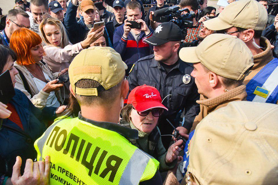 Прибывших ребят обступили люди, которые пришли почтить память погибших. Вскоре началась толкотня и словесная перепалка. При этом молодые парни постоянно кричат "Слава Украине". С обеих сторон слышны оскорбления, а обстановка накалена.