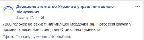 В Чернобыльском заповеднике сфотографировали симпатичного ежика, который без страха позировал исследователям. Фотография размещена на странице Госагентства Украины по управлению зоной отчуждения в Facebook.