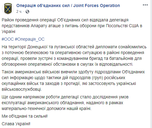 Делегация Аппарата атташе по вопросам обороны при посольстве США в Украине посетила на Донбассе зону ООС. Об этом в Facebook сообщает пресс-центр штаба.