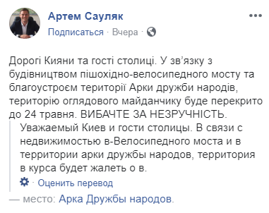 "Дорогие киевляне и гости столицы. В связи со строительством пешеходно-велосипедного моста и благоустройством территории Арки дружбы народов, территория смотровой площадки будет перекрыта до 24 мая. Извините за неудобства", - говорится в сообщении.