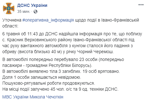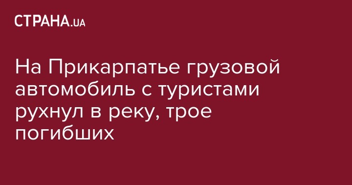 В Ивано-Франковской области в реку Черный Черемош, с высоты около 40 метров упал грузовой автомобиль с туристами (предположительно гражданами Беларуси). Три человека погибли, еще одного ищут спасатели. Об этом сообщает Госслужба по чрезвычайным ситуациям Украины на странице в соцсети Facebook.