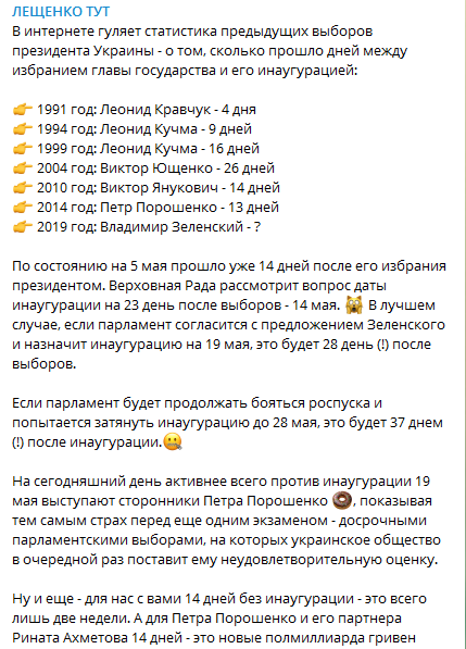 Лещенко также обращает внимание на то, что инаугурацию Зеленского затянули рекордно. Еще ни один из президентов столько не ждал вручения булавы.