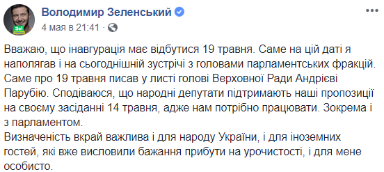 По состоянию на 5 мая прошло уже 14 дней после его избрания президентом. Верховная Рада рассмотрит вопрос даты инаугурации на 23 день после выборов - 14 мая. В лучшем случае, если парламент согласится с предложением Зеленского и назначит инаугурацию на 19 мая, это будет 28 день (!) после выборов.