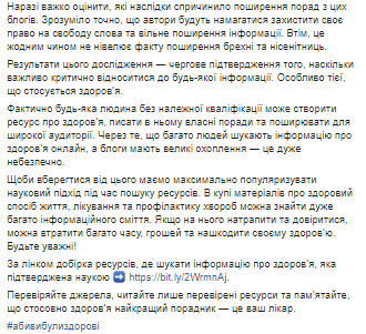 "Результаты этого исследования - очередное подтверждение того, насколько важно критически относиться к любой информации. Особенно той, что касается здоровья", - пишет Ульяна Супрун и добавляет, что фактически любой человек без надлежащей квалификации может создать ресурс о здоровье, писать в нем собственные советы и распространять для широкой аудитории. И это очень опасно, поскольку блоги о здоровье довольно популярны и имеют большой охват аудитории.