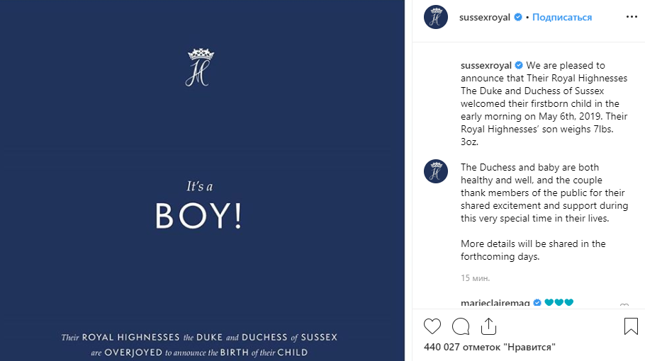 В королевской семье пополнение. В понедельник, 6 мая, герцогиня Сассексская Меган Маркл родила мальчика. Об этом сообщил Букингемский дворец в Instagram. Отмечается, что принц Гарри присутствовал на родах.
