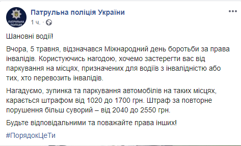 В честь Международного дня борьбы за права инвалидов, который отмечался накануне, 5 марта, сотрудники Патрульной полиции Украины предостерегли водителей от парковки на местах, предназначенных для водителей с инвалидностью и тех, кто перевозит инвалидов. Об этом говорится в посте правоохранителей в соцсети Facebook.
