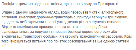 Водитель грузовика, который упал с обрыва сегодня днем вместе с группой белорусских туристов в реку Черный Черемош в с.Быстрец Верховинского района Ивано-Франковской области, был пьян в момент ДТП. Об этом сообщается на странице полиции Ивано-Франковской области в Facebook.