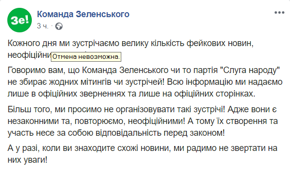 "Команда Зеленского то партия "Слуга народа" не собирает никаких митингов или встреч! Всю информацию мы предоставляем только в официальных обращениях и только на официальных страницах", - говорится в сообщении.