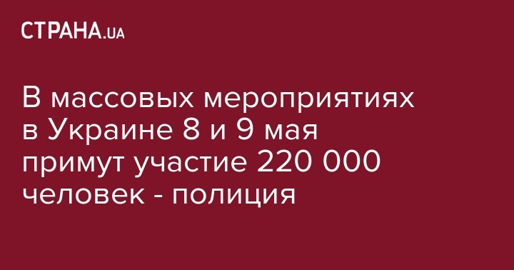 На этой неделе, 8 и 9 мая, в Украине будут проводиться мероприятия по случаю Дня памяти и примирения, а также Дня победы над нацизмом во Второй мировой войне. В них примут участие около 220 000 человек. Об этом сообщает пресс-служба Национальной полиции.