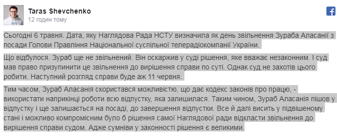Между тем, Зураб Аласания воспользовался возможностью, что дает кодекс законов о труде, - использовать в конце работы весь отпуск, который остался. Таким образом, Зураб Аласания ушел в отпуск и еще остается в должности до завершения отпуска. Все и дальше в подвешенном состоянии и возможно компромиссным было бы решение самого Наблюдательного совета отложить увольнение до разрешения дела судом. Ведь сомнения в законности решения являются большими", - написал Шевченко.