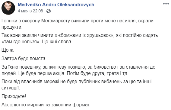 Скандал произошел в "Мегамаркете" на Нивках в Киеве 3 мая. О нем сам Медведько рассказал в Facebook.