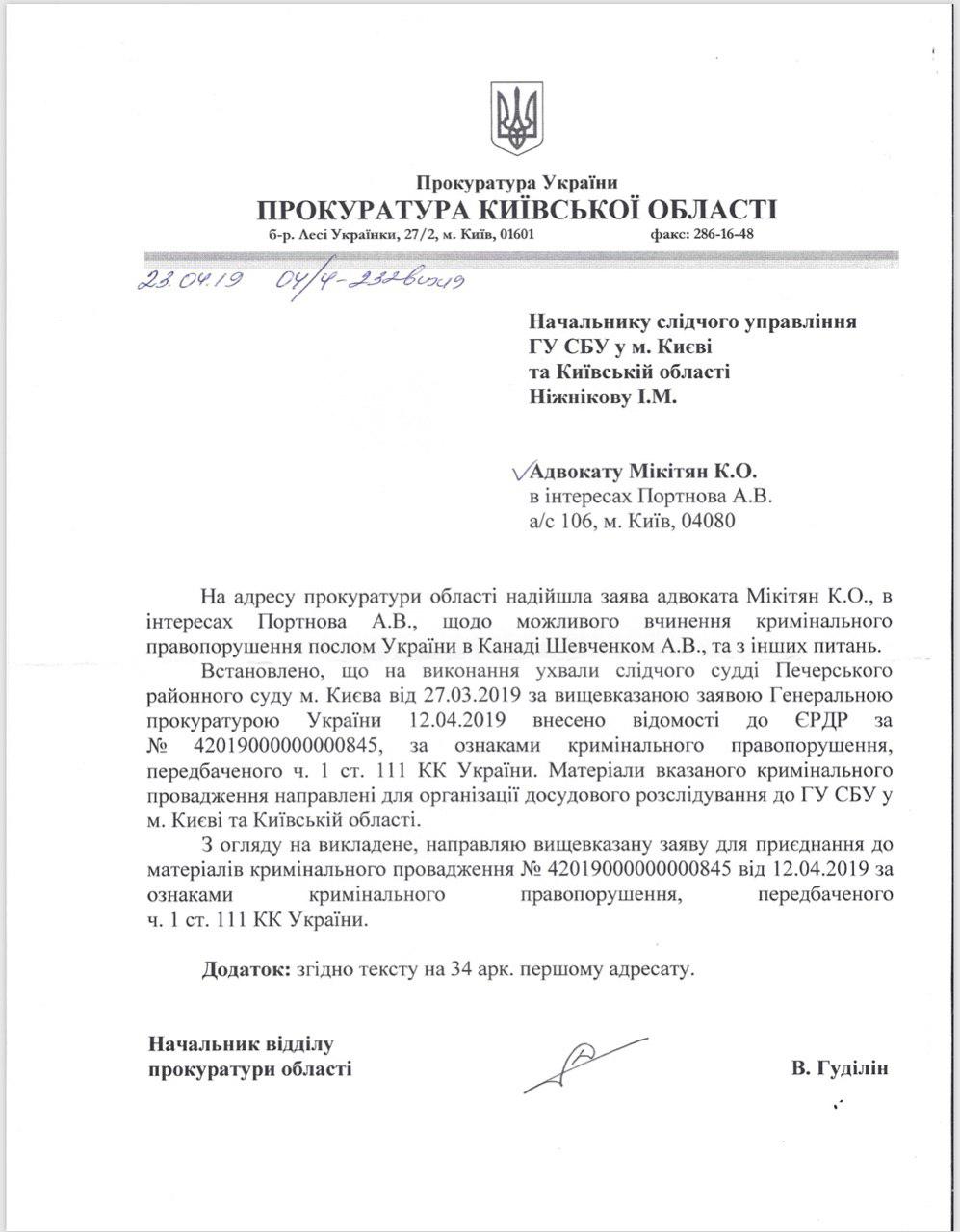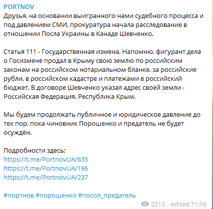 "На основании выигранного нами судебного процесса и под давлением СМИ, прокуратура начала расследование в отношении Посла Украины в Канаде Шевченко", - написал Портнов.