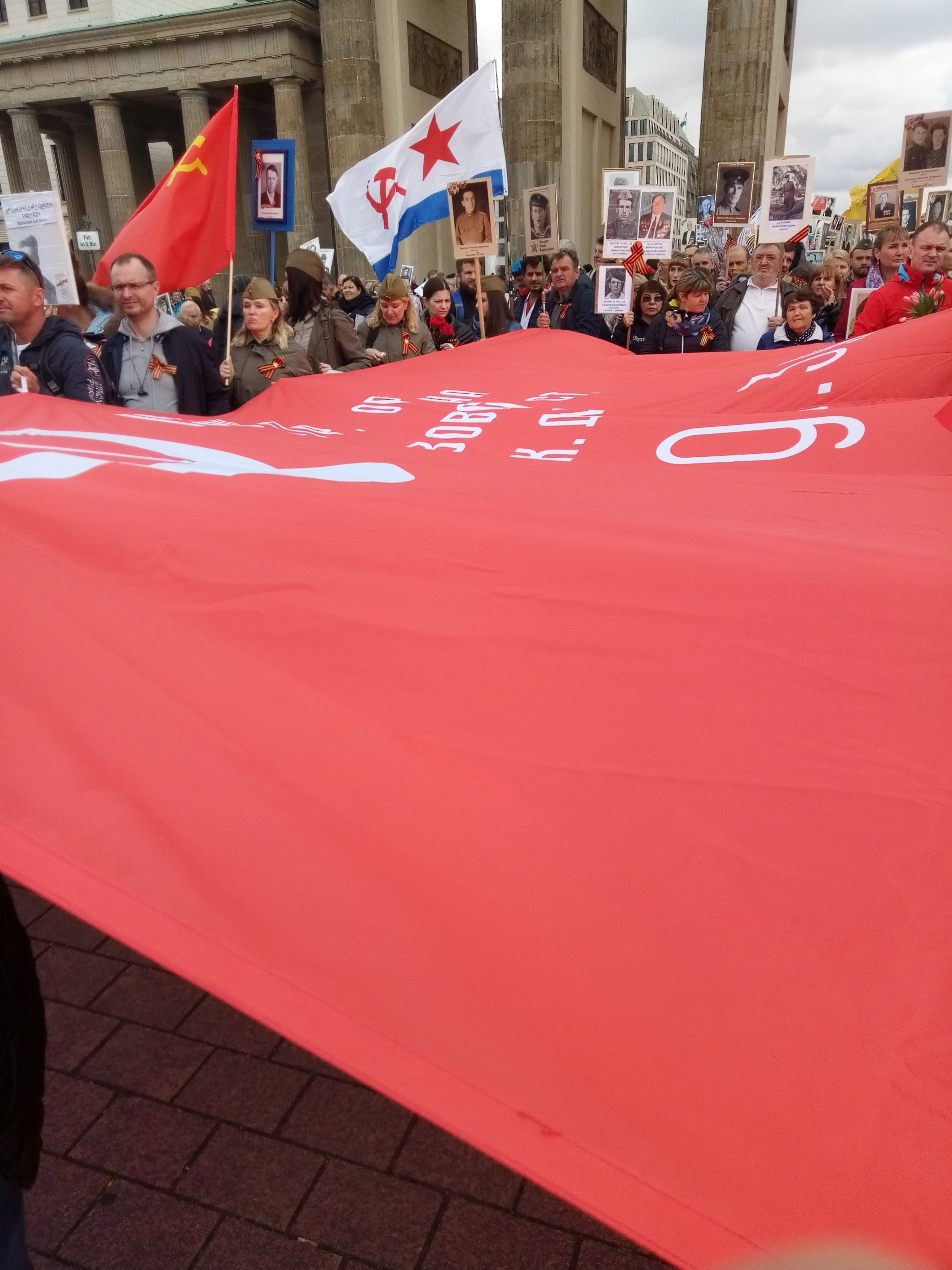 Выстроившийся "Бессмертный полк" развернул в Берлине гигантскую копию знамя Победы.