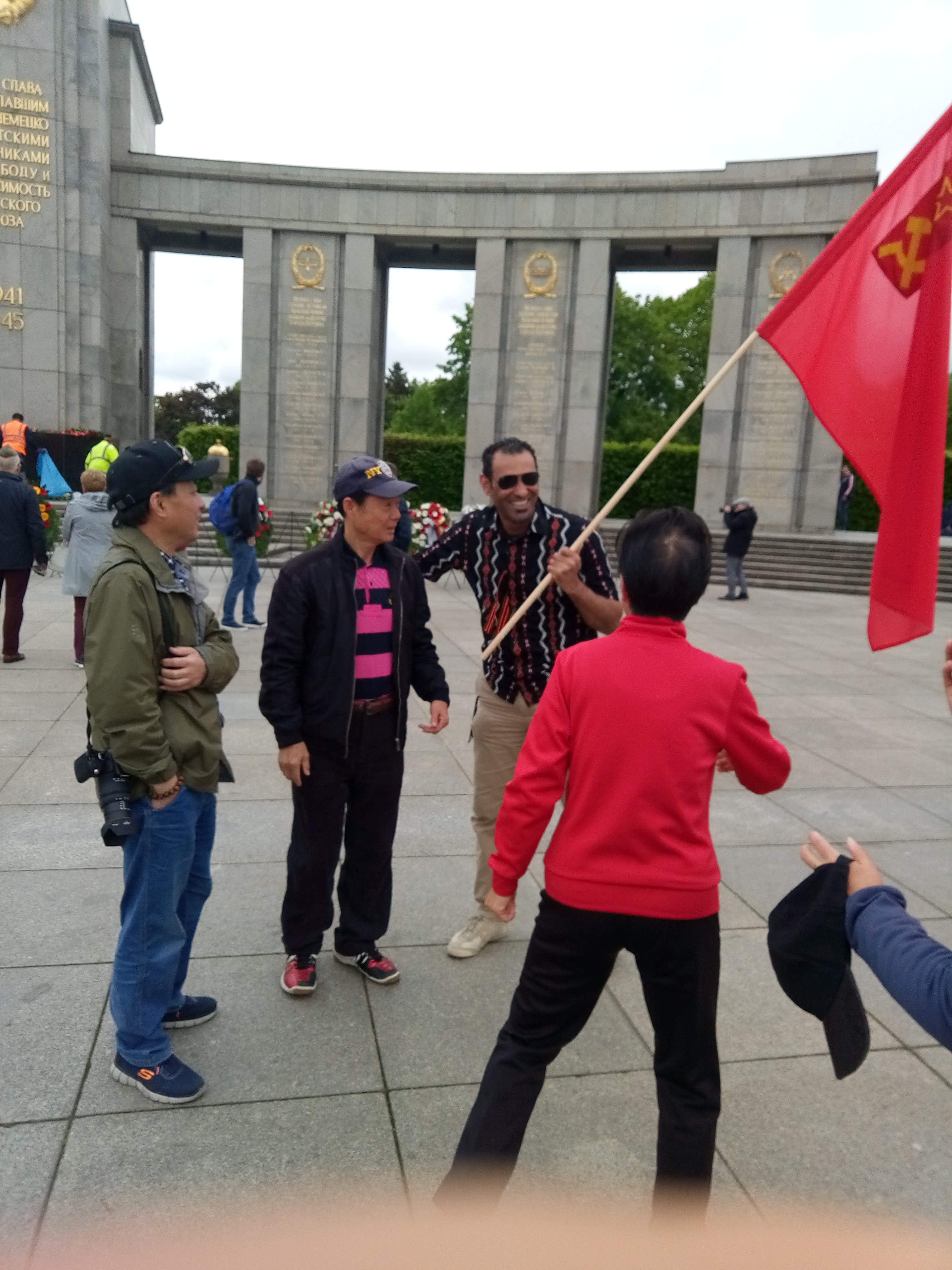 Туда же сходились и многие туристы. Например, группа из Китая просила разрешение сфотографироваться с копией знамя Победы. Туристы то и дело произносили: "товариси, товариси", копируя воинское приветствие.