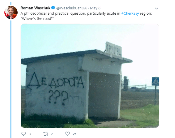 В качестве дополнения к рассказу о своем приключении, посол также опубликовал фото автобусной остановки с характерной надписью: "Философский и практический вопрос, который особо остро стоит в Черкасской области: "Где дорога?"