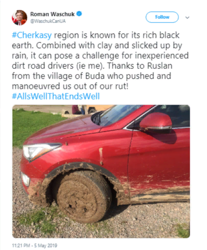 Чрезвычайный и полномочный посол Канады в Украине Роман Ващук застрял на бездорожье в Чигиринском районе Черкасской области. Об этом он написал на своей странице в Twitter.