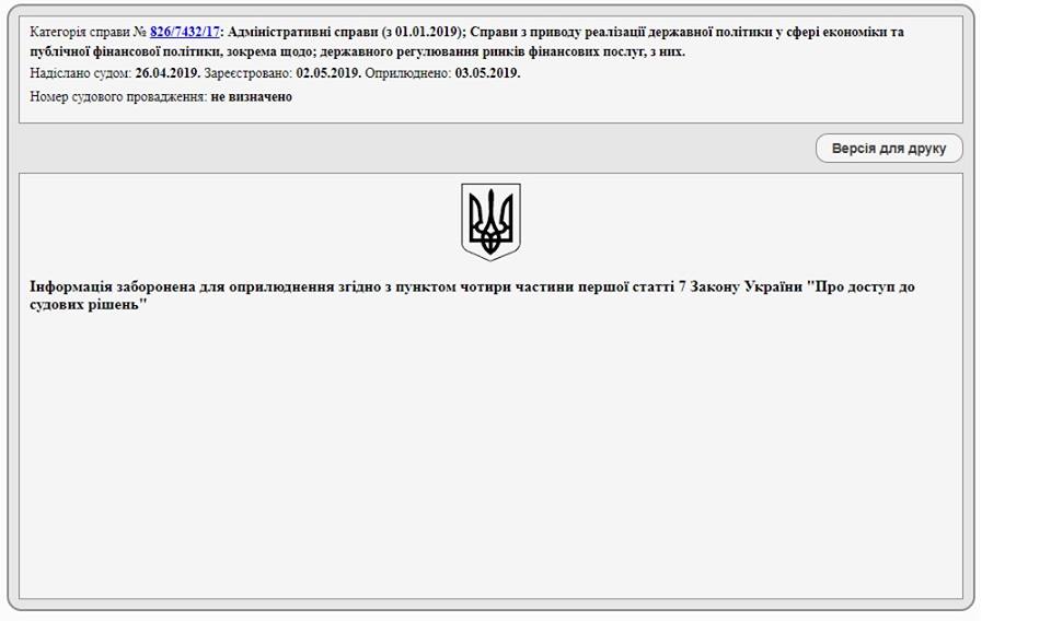 "Информация запрещена к обнародованию согласно пункту четыре части первой статьи 7 Закона Украины "О доступе к судебным решениям", - говорится в сообщении на сайте.