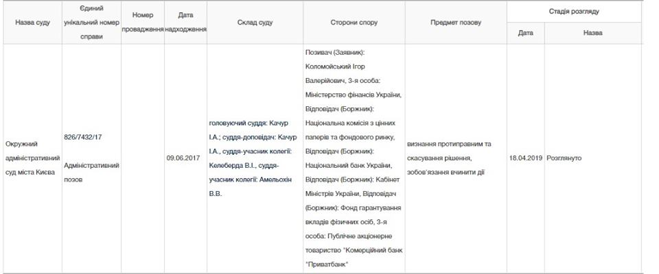 Ранее мы сообщали, что олигарх Игорь Коломойский подал еще пять исков к Нацбанку и Приватбанку. Он оспаривает пять кредитных договоров, а также свое поручительство по ним. Подготовительные заседания по делам назначены на 10 мая, 16 мая, 22 мая (два заседания) и 23 мая.