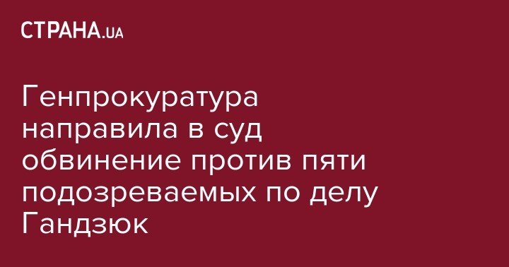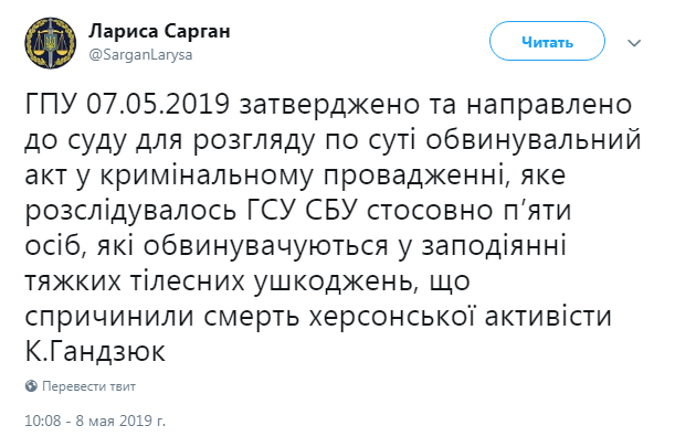 "ГПУ 7.05.2019 утвердила и направила в суд для рассмотрения по существу обвинительный акт в уголовном производстве, которое расследовало ГСУ СБУ в отношении пяти лиц, обвиняемых в причинении тяжких телесных повреждений, повлекших смерть херсонской активистки Екатерины Гандзюк" , - написала она.