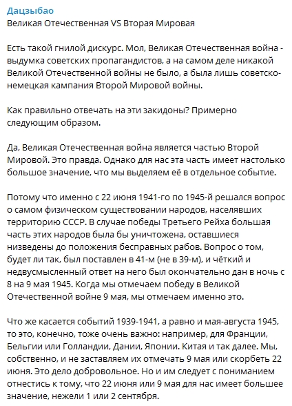 Телеграм-канал журналиста Юрия Ткачева "Дацзыбао" объясняет, почему мы отмечаем именно 9 мая: "Великая Отечественная VS Вторая Мировая. Есть такой гнилой дискурс. Мол, Великая Отечественная война - выдумка советских пропагандистов, а на самом деле никакой Великой Отечественной войны не было, а была лишь советско-немецкая кампания Второй Мировой войны.