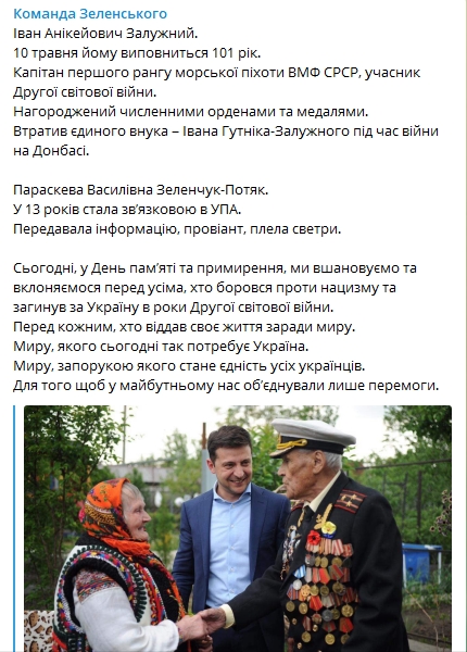 Команда избранного президента Владимира Зеленского опубликовала в Telegram фото двух ветеранов с подписью: "Иван Аникеевич Залужный. 10 мая ему исполнится 101 год. Капитан первого ранга морской пехоты ВМФ СССР, участник Второй мировой войны. Награжден многочисленными орденами и медалями. Потерял единственного внука - Ивана Гутника-Залужного во время войны в Донбассе.