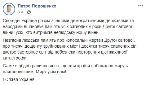 Так, президент Петр Порошенко написал: "Сегодня Украина вместе с другими демократическими государствами и народами чтит память всех погибших в годы Второй мировой войны, всех, кто выдержал нечеловеческую ношу войны.