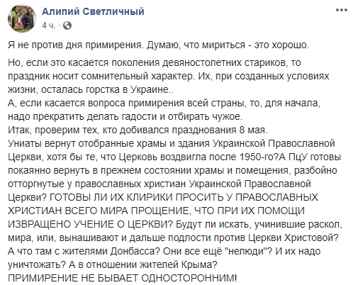 Архимандрит Алипий Светличный: "Я не против дня примирения. Думаю, что мириться - это хорошо. Но, если это касается поколения девяностолетних стариков, то праздник носит сомнительный характер. Их, при созданных условиях жизни, осталась горстка в Украине.