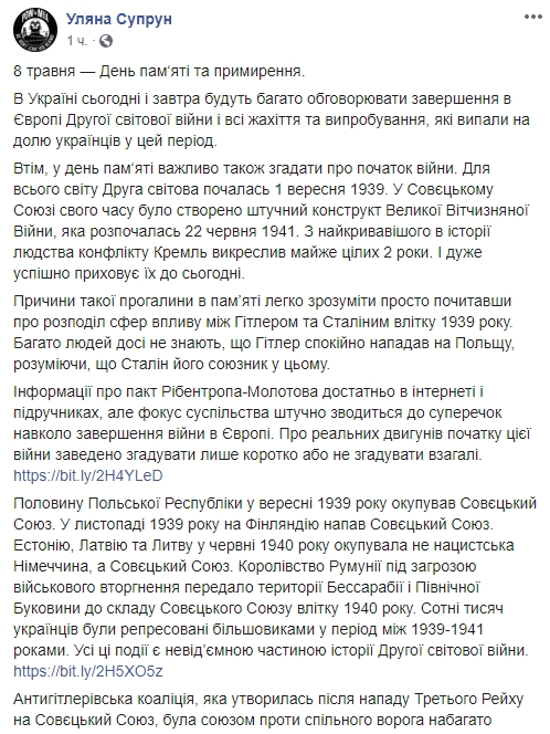 И.о. министра здравоохранения Ульяна Супрун также использовала 8 мая не для примирения, а для проклятий в адрес СССР: "В Украине сегодня и завтра будут много обсуждать завершение в Европе Второй мировой войны и все ужасы и испытания, которые выпали на долю украинцев в этот период.