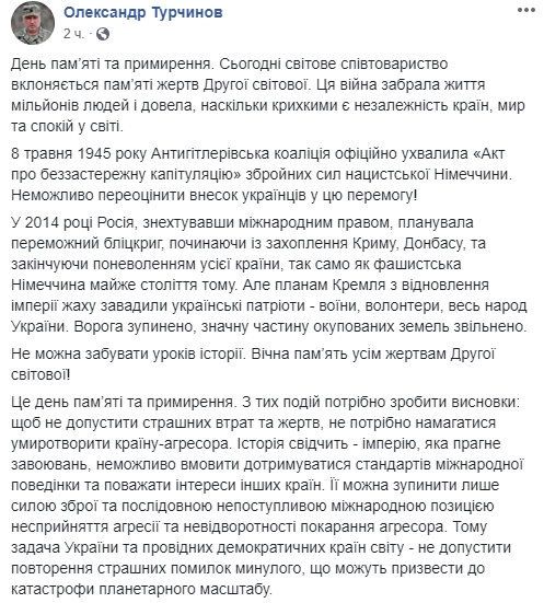 Глава СНБО Александр Турчинов: "День памяти и примирения. Сегодня мировое сообщество кланяется памяти жертв Второй мировой. Эта война унесла жизни миллионов людей и доказала, насколько хрупкими являются независимость стран, мир и спокойствие в мире.