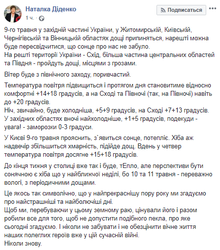 "9 мая в западной части Украины, в Житомирской, Киевской, Черниговской и Винницкой областях дожди прекратятся, наконец-то можно будет убедиться, что солнце о нас не забыло.