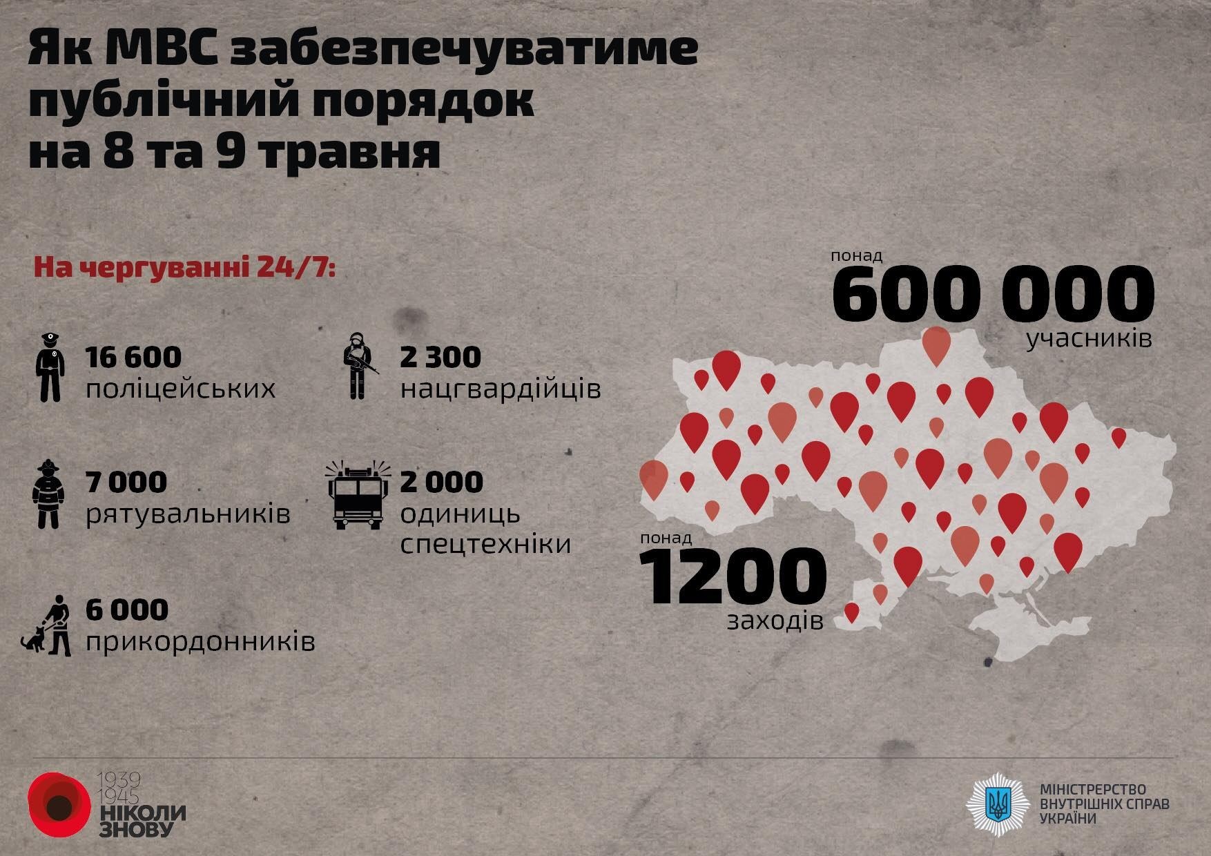 Все подразделения министерства внутренних дел с 8 мая работают в усиленном режиме, который завершится только лишь после всех мероприятий 9 мая. К охране общественного порядка и несения службы подразделениями МВД будет привлечено 16600 полицейских, 2300 национальных гвардейцев, 7000 спасателей, 2000 единиц спецтехники и в усиленном режиме будут работать 6000 пограничников.
