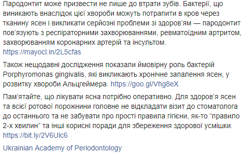 Глава Минздрава отметила, что пародонтит может привести не только к потере зубов. Бактерии, которые возникают вследствие этой болезни, могут попасть в кровь через ткань десен и вызвать серьезные проблемы со здоровьем - пародонтит связывают с респираторными заболеваниями, ревматоидным артритом, заболеванием коронарных артерий и инсультом. Также недавние исследования показали вероятную роль бактерий Porphyromonas gingivalis, которые вызывают хроническое воспаление десен, в развитии болезни Альцгеймера. "Помните, что лечить десны нужно оперативно. Для здоровья десен и всей ротовой полости главное не откладывать визит к стоматологу до последнего и не забывать о простых правилах гигиены, например, "правиле 2-х минут", и других полезных советах для сохранения здоровой улыбки", - подчеркнула Супрун.