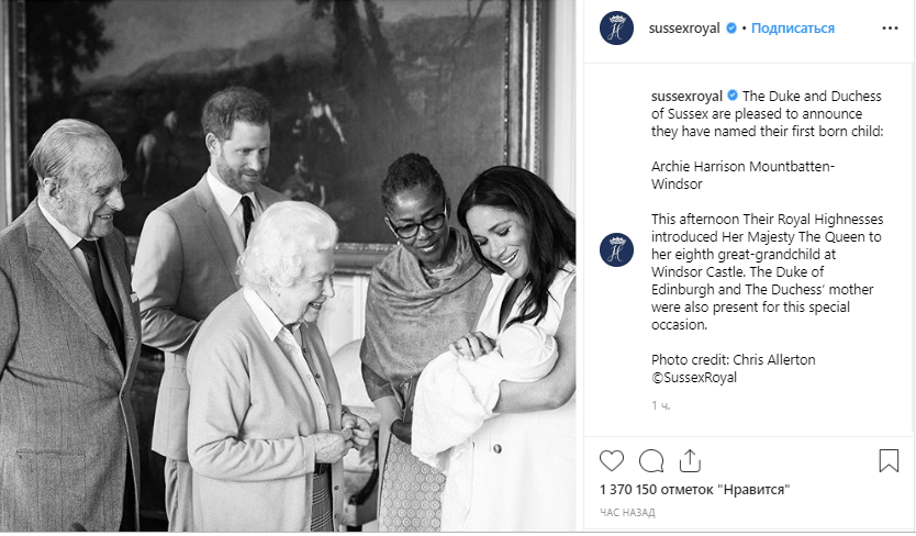 Меган Маркл и принц Гарри сообщили в Instagram, как назвали своего первенца