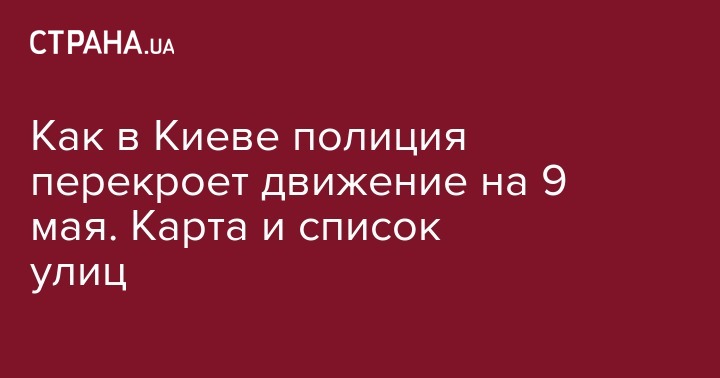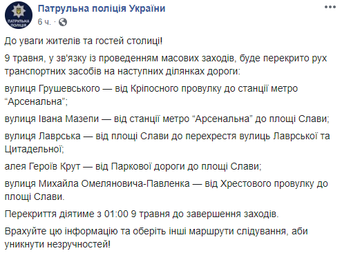 В четверг, 9 мая, в Киеве в связи с проведением массовых мероприятий, в которых примут участие 200 тысяч человек, будет перекрыто движение транспортных средств. Список улиц публикует патрульная полиция Украины в Facebook.
