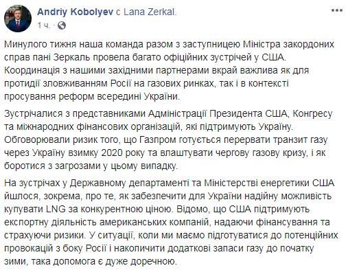 Противодействие строительству Россией газопровода Северный поток-2, возможности закупки американского сжиженного природного газа (LNG) и планы передачи украинской газотранспортной системы в концессию независимому оператору. Эти вопросы обсудила на минувшей неделе в США замглавы МИД Елена Зеркаль и глава правления НАК "Нафтогаз Украины" Андрей Коболев, пишет Коболев в Facebook