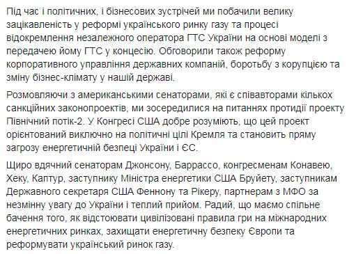 "Во время и политических, и деловых встреч мы увидели большую заинтересованность в реформе украинского рынка газа и процессе отделения независимого оператора ГТС Украины на основе модели с передачей ему ГТС в концессию", – написал он.