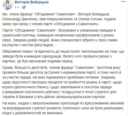 Войцицкая отметила, что на данном этапе "наше видение пути для защиты будущего украинцев кардинально отличается от позиции партии". "Поэтому политические пути расходятся, что не исключает плодотворного сотрудничества в других форматах и нашего пребывания во фракции "Самопомощь" до завершения полномочий, которые нам дали люди", - добавила она.