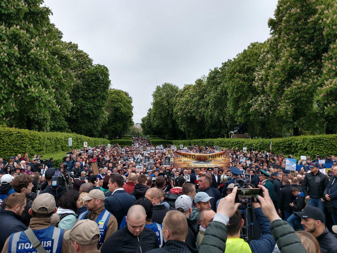 Против акции "Бессмертный полк" выступают националисты и радикалы. У Стеллы противники начали перекрикивать друг друга. Националисты кричат "Слава Украине!", а участники марша: "Фашизм не пройдет!"