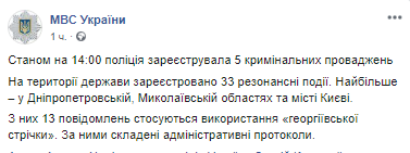 "По состоянию на 14:00 полиция зарегистрировала 5 уголовных производств. На территории государства зарегистрировано 33 резонансных события. Больше всего - в Днепропетровской, Николаевской областях и в Киеве", - говорится в сообщении.