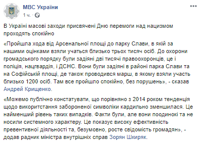 "Можем публично констатировать, что в сравнении с 2014 годом тенденция использования запрещенной символики кардинально уменьшилась… Факты такие были, но они единичны и не носили системного характера. Это показывает высокую эффективность превентивной деятельности и, безусловно, рост сознательности граждан", - цитирует МВД слова советника министра внутренних дел Украины Зоряна Шкиряка.
