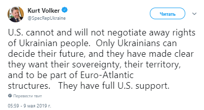 "США не могут и не будут вести переговоры о правах украинского народа. Только украинцы могут решить свое будущее, и они ясно дали понять, что хотят, чтобы их суверенитет, их территория были частью евроатлантических структур", - написал Волкер.