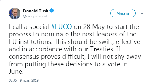 "Я созываю экстренный саммит ЕС на 28 мая, чтобы начать процесс назначения следующих лидеров институтов ЕС. Это должно произойти быстро, эффективно и соответствовать нашим соглашениям. Если консенсус окажется трудным, я не буду стесняться поставить это решение на голосование в июне", - написал Туск.